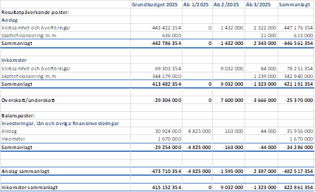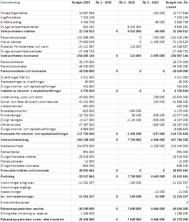 | Sammandrag | Bokslut 2024 | Budget 2025 | Äb 1 - 2 2025 | Förslag äb 3 2025 |
