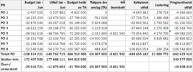 | Budget Jan - Jun | Utfall Jan - Jun | Budget helår ex TA | Tidigare års anslag (TA) | Kalkylerat utfall |