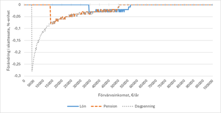 När det gäller den föreslagna ändringen av grundavdraget visar figuren nedan förändringen i skattesats för olika inkomsttagare vid olika inkomstnivåer om avdragets maxbelopp höjs från 3 825 euro till 3 925 euro. Skattesatsen minskar mest för dem som får dagpenning (grön linje), medan effekten för pensionstagare (röd linje) och löntagare (blå linje) är mer begränsad. Vid högre inkomstnivåer upphör effekten helt.